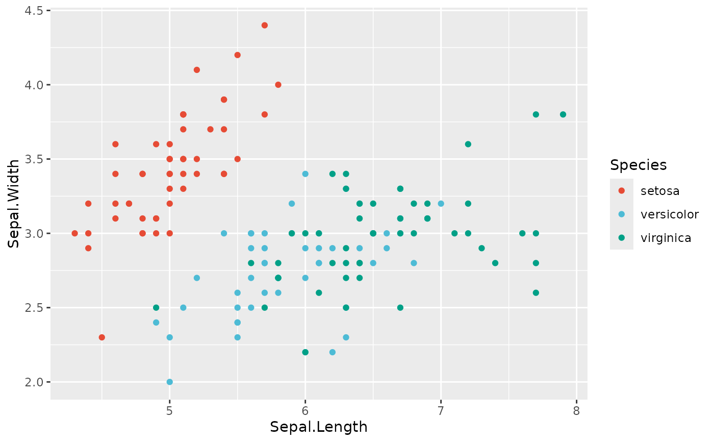 ggplot2::ggplot(iris, ggplot2::aes(Sepal.Length, Sepal.Width, color = Species)) +