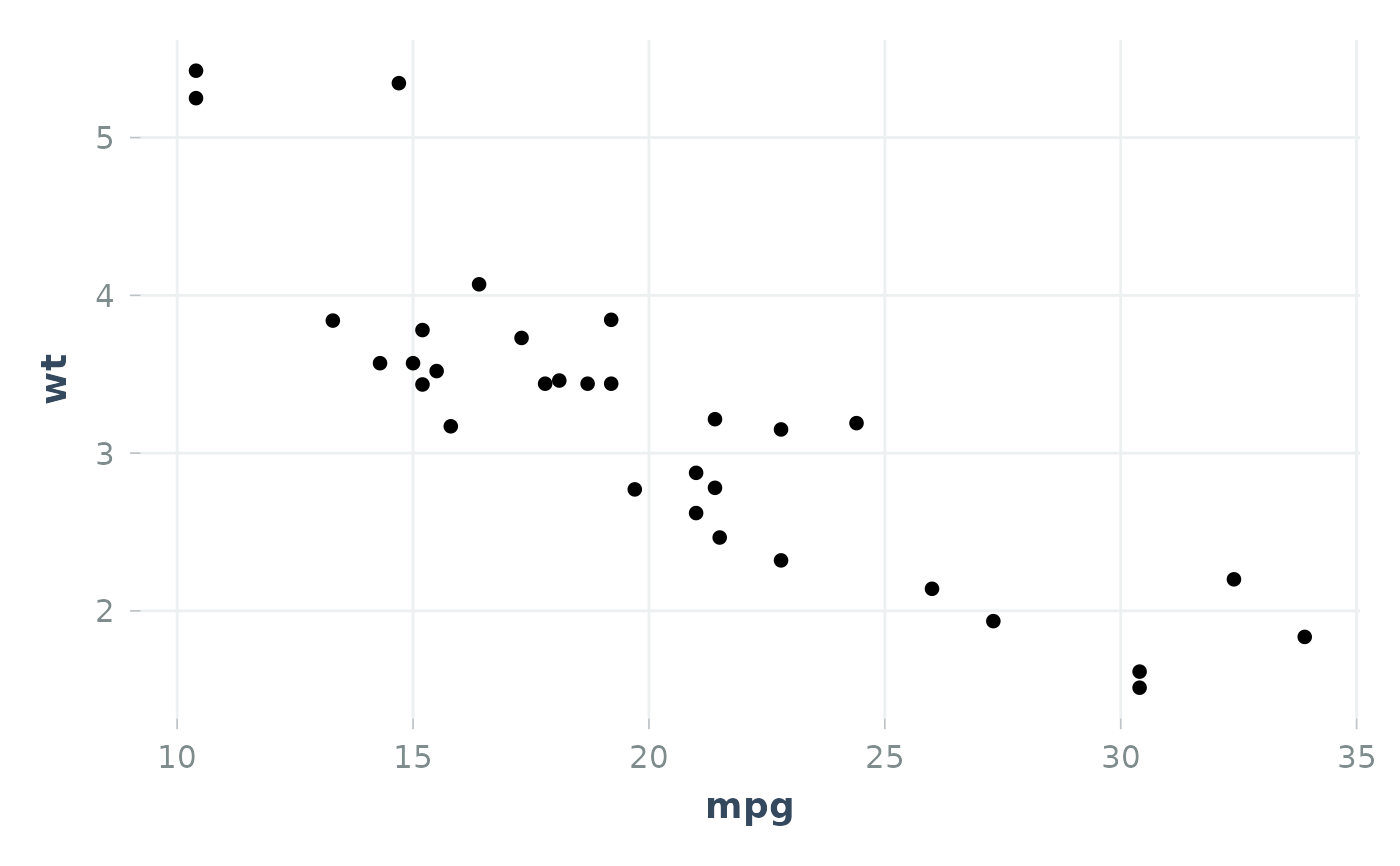 ggplot2::ggplot(mtcars, ggplot2::aes(mpg, wt)) +